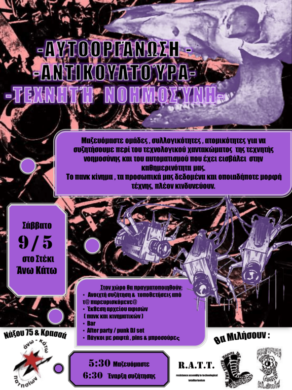 Συνειδητοποιούμε σαν ομάδα , πως υπάρχει μια ουδετερότητα από τα μέλη του -πανκ, αλλά όχι μόνο- κινήματος, η οποία πηγάζει από ελλιπής ενημέρωση για το θέμα. Θεωρούμε ότι μόνο με ήρεμη και συντροφική συζήτηση θα αντιμετωπιστεί το πρόβλημα, ώστε να καταλάβουμε κιόλας όλα τον ρόλο ή μη που θέλουμε να έχει το ΑΙ στην πανκ, στο κίνημα και στην καθημερινότητά μας. Προτείνουμε αυτό το ανοιχτό κάλεσμα για συζήτηση περί του θέματος στο αυτοδιαχειριζόμενο στέκι Άνω-Κάτω Πατησίων το Σάββατο 9 Μάη στις 17.30, για να μπορέσουμε όλα να μοιραστούμε τους προβληματισμούς μας, και να εξηγηθούν καθαρά οι λόγοι για τους οποίους το ΑΙ δεν έχει θέση στον DIY χώρο. Η συζήτηση της εκδήλωσης είναι ανοιχτή, ακριβώς για να αναλυθεί πολύπλευρα το θέμα.