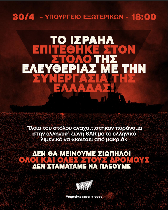 Σας καλούμε σε κάθε πόλη , σε κάθε γωνιά της Ελλάδας να βγούμε στους δρόμους για να υψώσουμε την φωνή μας ενάντια στην ελληνική συνενοχή αλλά και για να εγγυηθούμε ότι ο στόλος θα συνεχίσει την πορεία του προς τη Γάζα!