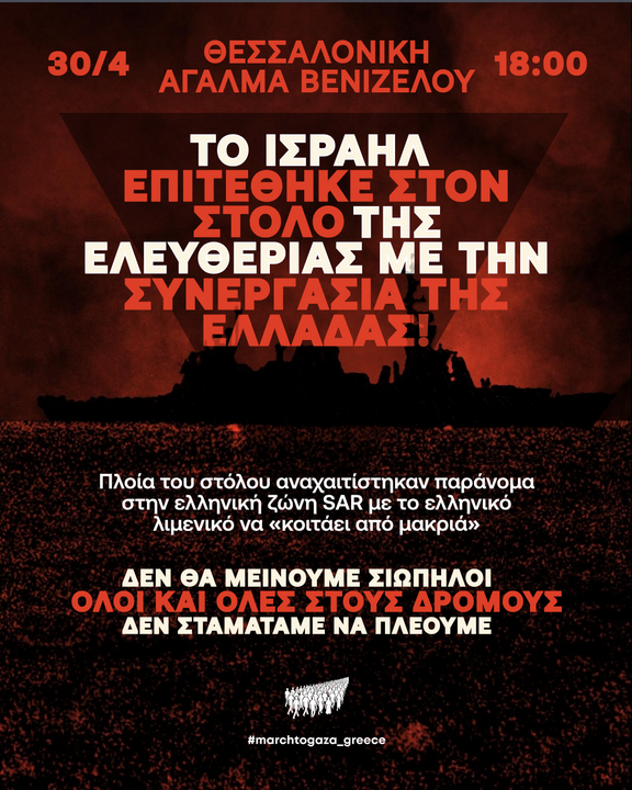Σας καλούμε σε κάθε πόλη , σε κάθε γωνιά της Ελλάδας να βγούμε στους δρόμους για να υψώσουμε την φωνή μας ενάντια στην ελληνική συνενοχή αλλά και για να εγγυηθούμε ότι ο στόλος θα συνεχίσει την πορεία του προς τη Γάζα!