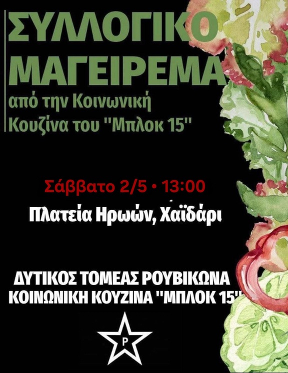 Το Σάββατο 2/5 - 13:00 θα πραγματοποιηθεί συλλογικό μαγείρεμα στην πλατεία Ηρώων στο Χαϊδάρι.
