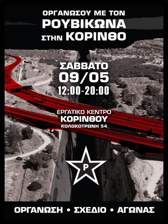 Το Σάββατο, 9 Μάη, μέλη του Ρουβίκωνα θα βρίσκονται στην Κόρινθο, προκειμένου να συνομιλήσουν με κόσμο που ενδιαφέρεται να αποτελέσει κομμάτι ενός πυρήνα της οργάνωσης στην περιοχή. Οι συζητήσεις θα λάβουν χώρα στο Εργατικό Κέντρο Κορίνθου, από τις 12:00 έως τις 20:00.
