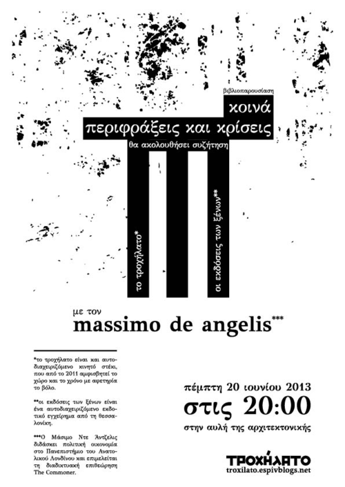 Βιβλιπαρουσίαση με τον Massimo de Angelis και τις εκδόσεις των ξένων. Θα ακολουθήσει κουβέντα γύρω απο το θέμα του βιβλίου "κοινά, περιφράξεις και κρίση".