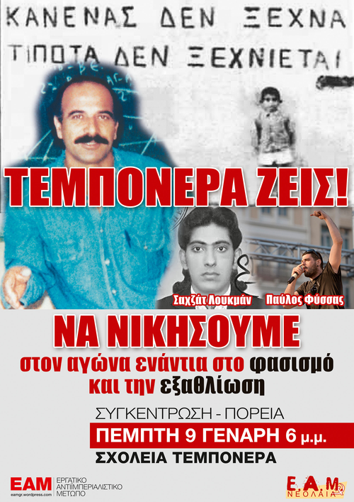 Σε μια νύχτα τους έπνιξε το αίμα του Φύσσα και μετά ήρθαν τα αφεντικά τους να διαχειριστούν μαζί με τα αποκαΐδια της ζωής που μας κλέβουν και τον αντιφασισμό!!!! Κρυμμένες δικογραφίες, συλλήψεις, προφυλακίσεις, τηλεοπτικά σόου, απαγόρευση χρηματοδότησης της εγκληματικής οργάνωσης!!! Χωρίς ποτέ να ομολογήσουν όλοι ότι αυτό είναι η καραμπινάτη τρομοκρατία τους απέναντι στην κοινωνία της εργασίας. Γιατί το ματωμένο μαχαίρι που έκοψε το νήμα της ζωής του Σ. Λουκμάν και του Π. Φύσσα γράφει Χρυσή Αυγή, αλλά το θηκάρι γράφει συγκυβέρνηση και τρόικα.
