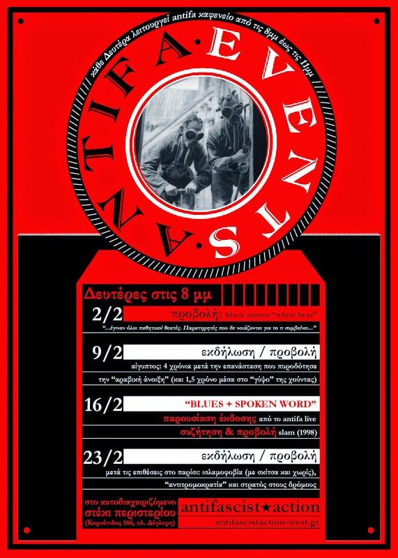 Στα πλαίσια του antifa events, το antifascist action θα πραγματοποιεί τις Δευτέρες στις 20:00 δραστηριότητες και εκδηλώσεις στο αυτοδιαχειριζόμενο στέκι Περιστερίου (Καρυάτιδος 166, πλατεία Δέγλερη).