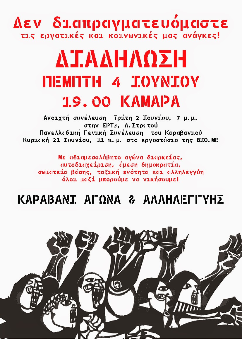 Το Καραβάνι Αγώνα & Αλληλεγγύης που ξεκίνησε εδώ και λίγους μήνες είναι μια ενότητα «από τα κάτω» και αφορά την κοινή δράση εκατοντάδων εργαζομένων και ανέργων απ' όλη την Ελλάδα. Το Καραβάνι που πλαισιώνεται συνεχώς από νέους αγώνες, αποτελείται από ανθρώπους εργατικών/κοινωνικών συλλογικοτήτων και αγωνιστές που αποφάσισαν να πορευτούν όρθιοι και να διεκδικήσουν δυναμικά τα δικαιώματά τους αρνούμενοι να αποδεχτούν τη λογική της ανάθεσης και του «τέλους της ιστορίας». Οι πραγματικές αιτίες της κοινωνικής καταστροφής που βιώσαμε τα τελευταία χρόνια δεν θα ακυρωθούν αν εμείς δεν αυτενεργήσουμε για να τις καταργήσουμε στην πράξη μέσα από νέους ακηδεμόνευτους αγώνες.