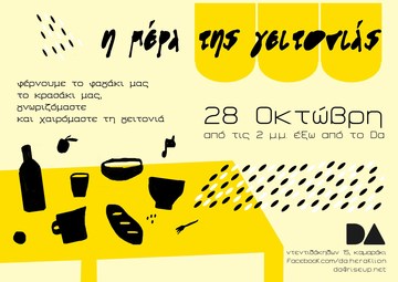 Την 28η του Οκτώβρη, και από τις 14:00, ο δρόμος μπροστά από τον αυτοδιαχειριζόμενο χώρο Da παίρνει ζωή! Για δεύτερη φορά, οι άνθρωποι της γειτονιάς συναντιούνται στο δρόμο, μοιράζονται το φαγητό και το ποτό τους, γνωρίζονται κι επικοινωνούν.