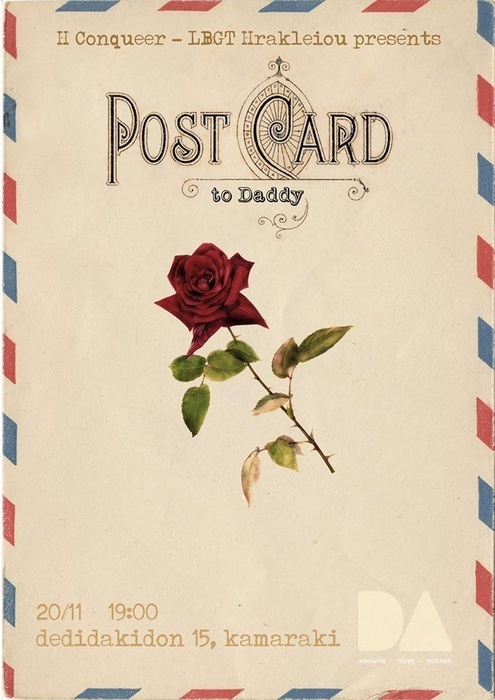 Μετά από τα τελευταία περιστατικά βιασμών στη Λάρισσα , τα Χανιά , την Θεσσαλονίκη , το Ηράκλειο και σε όλη την Ελλάδα , σε μια περίοδο έξαρσης της έμφυλης βίας και της κουλτούρας του βιασμού και κινητοποίησης του φεμινιστικού κινήματος , η ομάδα φύλου & σεξουαλικότητας Ηρακλείου ConQueer επιλέγει να προβάλλει το ντοκιμαντέρ : '' Postcard to Daddy'' .