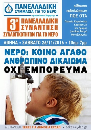 ΠΑΝΕΛΛΑΔΙΚΗ ΣΥΜΜΑΧΙΑ ΓΙΑ ΤΟ ΝΕΡΟ - Δίκτυο Κινημάτων και Συλλογικοτήτων symmaxianerou.blogspot.gr ΔΕΛΤΙΟ ΤΥΠΟΥ - Αθήνα 16/11/2016 3η Πανελλαδική Συνάντηση κινημάτων και συλλογικοτήτων Αθήνα 26/11/2016 Ακόμα και το Νερό; ΑΝΘΡΩΠΙΝΗ ΑΣΠΙΔΑ για την προστασία του δημόσιου νερού σε όλη την Ελλάδα Η κυβέρνηση, οι «θεσμοί» και τα ιδιωτικά συμφέροντα προωθούν άμεσα, όσα προβλέπονται στο 3ο μνημόνιο και στον πρόσφατο ν. 4389/2016. Με τη δημιουργία του Υπερταμείου παραχωρείται για 99 χρόνια στο χρέος, στους δανειστές και στα ιδιωτικά συμφέροντα το σύνολο της δημόσιας περιουσίας, άρα και των επιχειρήσεων ύδρευσης και αποχέτευσης (ΕΥΔΑΠ, ΕΥΑΘ). Η Υπουργική απόφαση για την «Ανάκτηση Πλήρους Κόστους για της Υπηρεσίες Ύδατος», αποτελεί θεσμική κατοχύρωση της εμπορευματοποίησης του κύκλου του νερού σε όλη τη χώρα. Με την συμφωνία ανάμεσα σε ΗΠΑ και Ευρωπαϊκή Ένωση (ΤΤΙP) καθώς και αυτή ανάμεσα σε Καναδά και Ευρωπαϊκή Ένωση (CETA) οι πολυεθνικές του νερού θα αποφασίζουν ερήμην πολιτών και κυβερνήσεων. Η Πανελλαδική Συμμαχία για το Νερό είναι ένα δίκτυο κινημάτων και συλλογικοτήτων, με καταστατική αρχή ότι «το νερό είναι κοινό αγαθό, δεν είναι εμπόρευμα και δεν μπορεί να αποτελέσει αντικείμενο οποιασδήποτε μορφής κερδοσκοπίας. Το νερό είναι ζωτικής σημασίας για όλα τα έμβια όντα και τα οικοσυστήματα. Δεν είναι αποθήκη ενέργειας για «πράσινη» και ιδίως χρηματιστηριακή εκμετάλλευση» Μετά την 1η Πανελλαδική Συνάντηση στη Θεσσαλονίκη (Σεπτέμβριος 2014) και τη 2η στο Βόλο, (Νοέμβριος 2014), στην 3ηΠανελλαδική Συνάντηση στη Αθήνα στις 26/11, συλλογικότητες από όλη την Ελλάδα, θα παρουσιάσουν τη δράση και τις θέσεις τους από τους αγώνες στην περιοχή τους και φιλοδοξούμε η δικτύωση, η αλληλοϋποστήριξης των κινημάτων και των συλλογικοτήτων να οδηγήσει στη δημιουργία ΑΝΘΡΩΠΙΝΗΣ ΑΣΠΙΔΑΣ για την προστασία του δημόσιου νερού, ως κοινού αγαθού, σε όλη την Ελλάδα. Η προστασία των υδάτων από τη μόλυνση των μεταλλευτικών δραστηριοτήτων, η προστασία των υδροβιοτόπων και των υδροφορέων, οι συνέπειες από τη δημιουργία μεγάλων φραγμάτων, η φθηνή και κατάλληλη πρόσβαση σε επαρκείς ποσότητες αγροτικού νερού, οι συνθήκες υγιεινής λόγω ανεπαρκών ή ακατάλληλων υποδομών αποχέτευσης είναι στην οπτική, στην αγωνία, στη σκέψη και στη δράση της Πανελλαδικής συμμαχίας για το νερό. Όπου το Νερό κινδυνεύει η Πανελλαδική συμμαχία για το Νερό θα είναι εκεί. Θεωρούμε την καθολική, ατομική και συλλογική, απρόσκοπτη πρόσβαση σε φθηνές, ποιοτικές και επαρκείς, υπηρεσίες ύδρευσης - αποχέτευσης Ανθρώπινο Δικαίωμα. Το νερό είναι Κοινωνικό Αγαθό και όχι εμπόρευμα. Η ΕΥΔΑΠ, η ΕΥΑΘ και οι ΔΕΥΑ να ανασυγκροτηθούν ως δημόσιοι οργανισμοί, στην υπηρεσία της κοινωνίας και όχι ως μέσο κερδοσκοπίας ιδιωτικών συμφερόντων. Να θεσμοθετηθούν από την ελληνική πολιτεία οι αποφάσεις του ΟΗΕ, του Συμβουλίου Ανθρωπίνων Δικαιωμάτων και του Συμβουλίου της Ευρώπης που αναγνωρίζουν το πόσιμο νερό και τις υπηρεσίες ύδρευσης-αποχέτευσης ως ανθρώπινο δικαίωμα άρρηκτα δεμένο με το δικαίωμα στη ζωή, στην υγιεινή και την ανθρώπινη αξιοπρέπεια. Να κατοχυρωθεί συνταγματικά, στην επικείμενη συνταγματική αναθεώρηση, η δημόσια ιδιοκτησία των οργανισμών ύδρευσης-αποχέτευσης, ο κοινωνικός έλεγχος και η δημόσια διαχείριση του κύκλου του νερού.