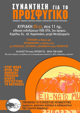 · Οι διαφαινόμενες εξελίξεις στο προσφυγικό και η στάση του κινήματος απέναντι στην πολιτική της κυβέρνησης, της Ε.Ε., δήμων και περιφερειών και στην απόφαση της Κομισιόν για ενεργοποίηση της διαδικασίας επαναπροώθησης των αιτούντων άσυλο, σύμφωνα με τη Συνθήκη του Δουβλίνου, από τις 15 Μαρτίου 2017.