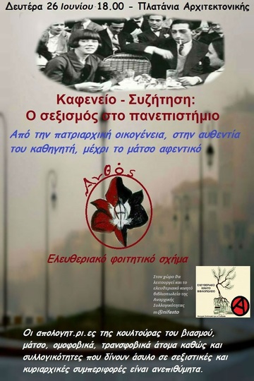 Την Δευτέρα 26 Ιουνίου στις 6 μ.μ. πίνουμε καφέ στα Πλατάνια της Αρχιτεκτονικής και συζητάμε προβληματισμούς, ιδέες και προτάσεις πάνω σε ζητήματα σεξισμού στο πανεπιστήμιο και στις ζωές μας.